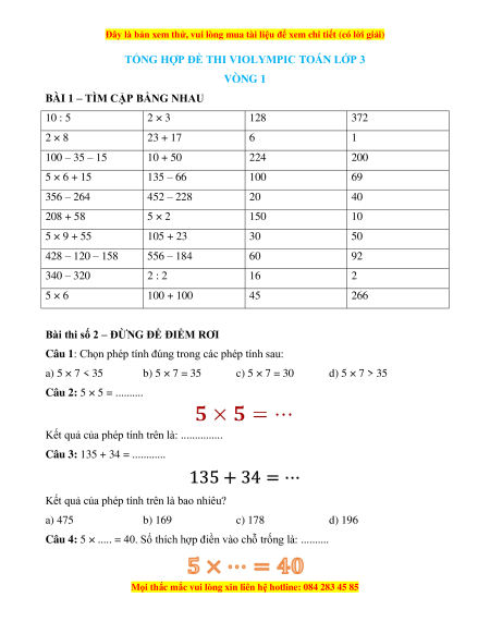 TỔNG HỢP ĐỀ THI VIOLYMPIC TOÁN LỚP 3 VÒNG 1