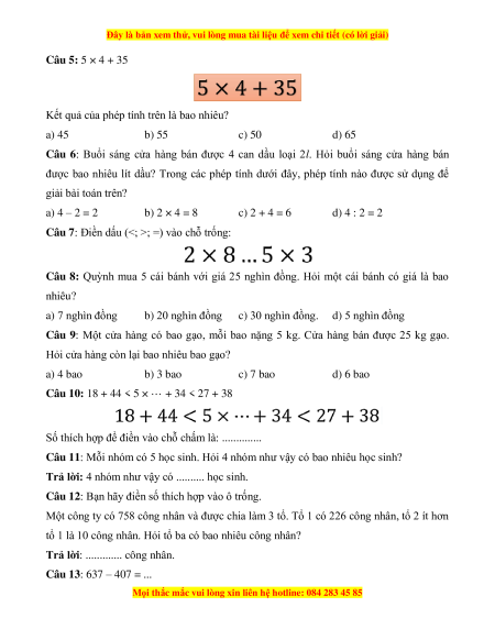 Câu 1: Chọn phép tính đúng trong các phép tính sau: a) 5 × 7 < 35 b) 5 × 7 = 35 c) 5 × 7 = 30 d) 5 × 7 > 35