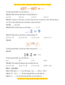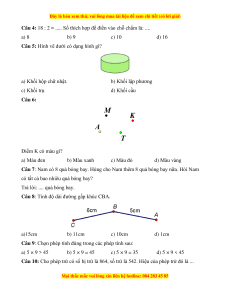Câu 17: Phép tính nào dưới đây có kết quả bằng 38? a) 5 × 5 + 23 b) 2 × 8 + 30 c) 5 × 4 + 28 d) 5 × 7 + 3 Câu 18: