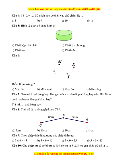 Câu 4: 18 : 2 = ..... Số thích hợp để điền vào chỗ chấm là: .... a) 8 b) 9 c) 10 d) 16