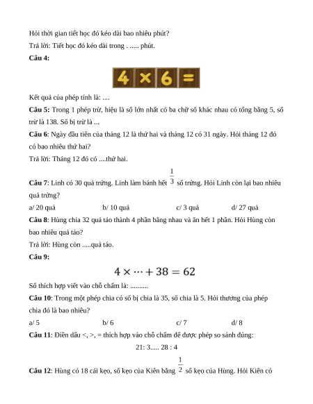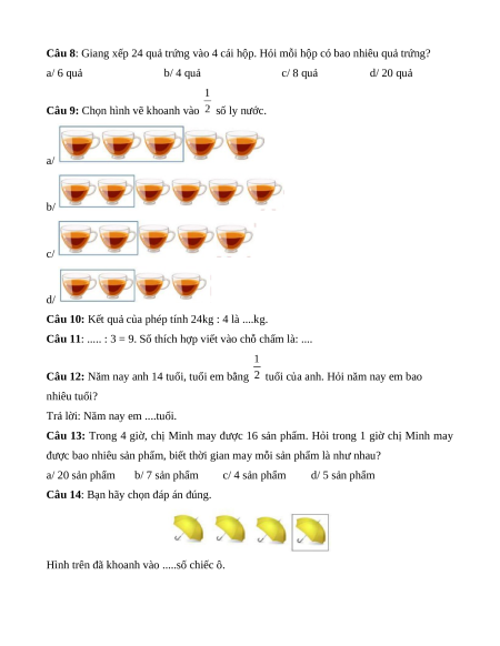 Câu 10: Kết quả của phép tính 24kg : 4 là ....kg.