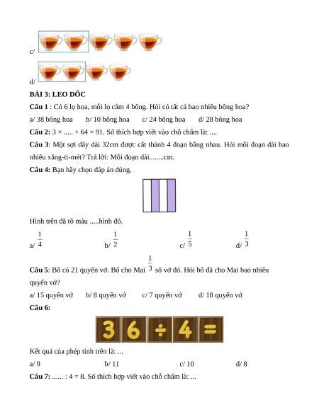 Câu 20: Chọn hình vẽ khoanh vào số ly nước. a/ b/ c/ d/ BÀI 3: LEO DỐC