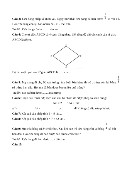 Câu 3: Cửa hàng nhập về 80m vải. Ngày thứ nhất cửa hàng đã bán được số vải đó.