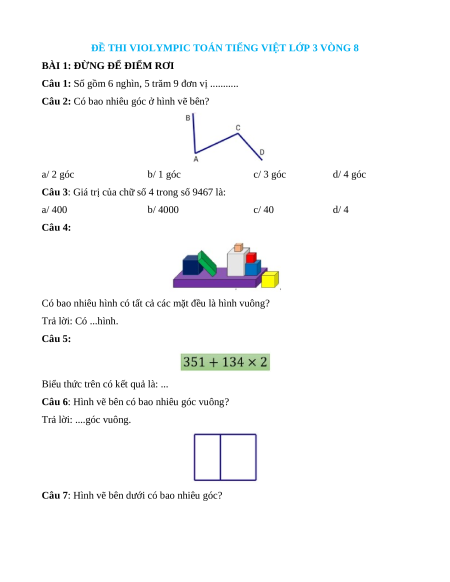 ĐỀ THI VIOLYMPIC TOÁN TIẾNG VIỆT LỚP 3 VÒNG 8