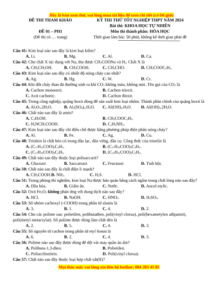 Đề Tốt nghiệp Hóa học 2024 theo đề tham khảo (Đề 1)