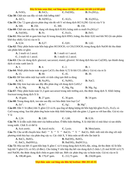 Câu 62: Thủy phân hoàn toàn hỗn hợp gồm HCOOCH3 và CH3COOCH3 trong dung dịch NaOH thì thu được sản phẩm hữu cơ gồm