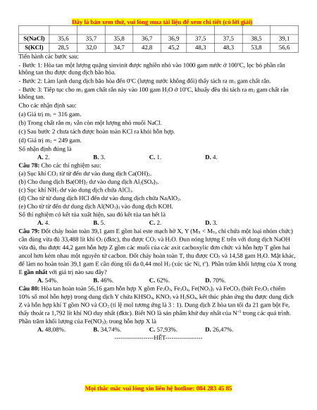 Câu 77: Để tách lấy lượng phân bón kali người ta thường tách kali clorua khỏi quặng sinvinit, thành phần chính