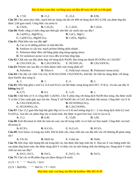 Câu 60: Nước cứng có tính cứng tạm thời gây nên bởi các muối nào sau đây? A. Ca(NO3)2, Mg(NO3)2. B. CaCl2, MgCl2.
