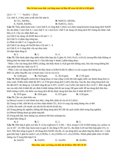 Câu 72: Thủy phân hoàn toàn 1 mol chất E có công thức C9H8O4 (có chứa vòng benzen) trong dung dịch NaOH