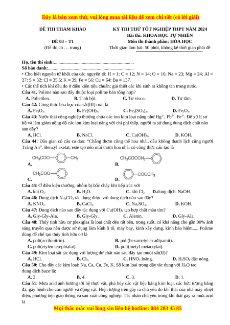 Đề Tốt nghiệp Hóa học 2024 theo đề tham khảo (Đề 3)