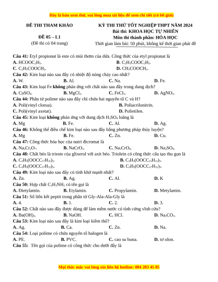 Đề Tốt nghiệp Hóa học 2024 theo đề tham khảo (Đề 5)