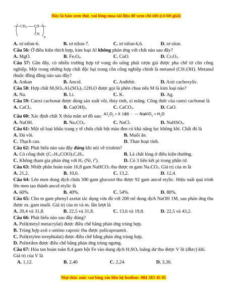 Câu 57: Gần đây, có nhiều trường hợp tử vong do uống phải rượu giả được pha chế từ cồn công