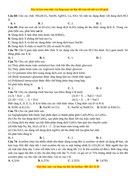 Câu 68: Cho các chất: NH4HCO3, NaOH, AgNO3, Cu, FeO. Số chất tác dụng được với dung dịch HCl là A. 4. B. 3. C. 2. D. 5.