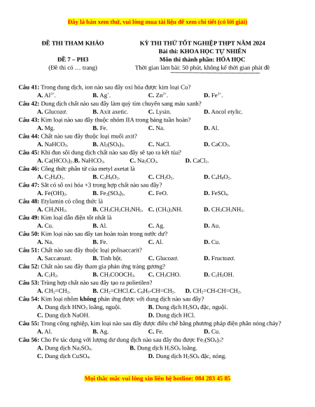 Đề Tốt nghiệp Hóa học 2024 theo đề tham khảo (Đề 7)