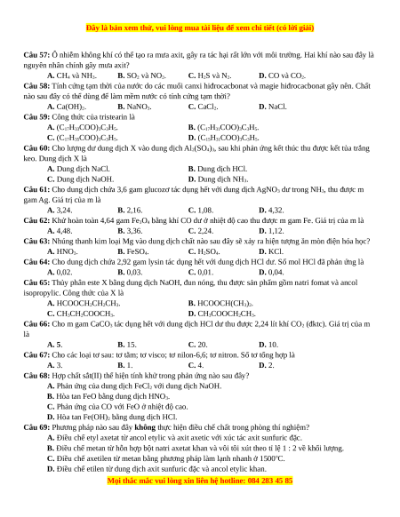 Câu 58: Tính cứng tạm thời của nước do các muối canxi hiđrocacbonat và magie hiđrocacbonat gây nên. Chất