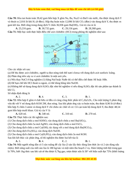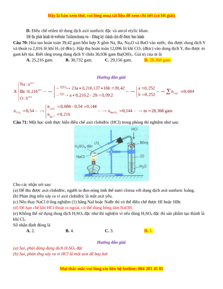 Câu 71: Một học sinh thực hiện điều chế axit clohiđric (HCl) trong phòng thí nghiệm như sau: Cho các nhận xét sau: