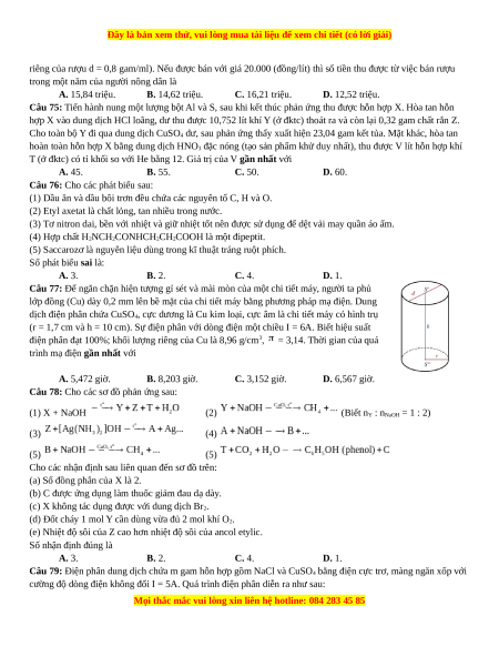 Câu 78: Cho các sơ đồ phản ứng sau: (1) X + NaOH (2) (Biết nY : nNaOH = 1 : 2) (3) (4) (5) (5)