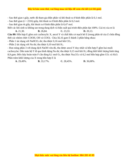 Câu 79: Điện phân dung dịch chứa m gam hỗn hợp gồm NaCl và CuSO4 bằng điện cực trơ, màng ngăn xốp với