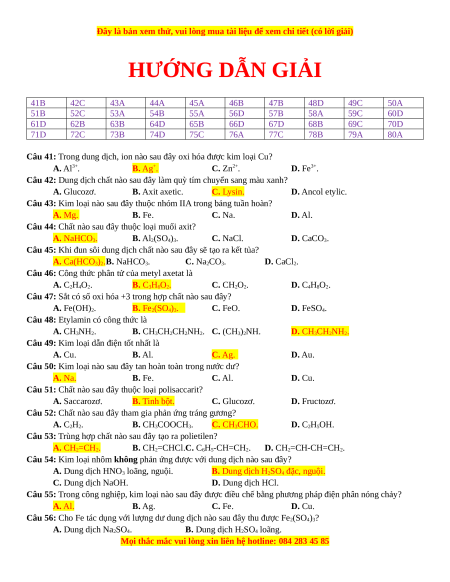 Câu 41: Trong dung dịch, ion nào sau đây oxi hóa được kim loại Cu? A. Al3+. B. Ag+. C. Zn2+. D. Fe3+.