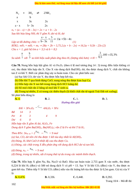 Câu 78. Nung hỗn hợp bột gồm Al và Fe3O4 (theo tỉ lệ mol tương ứng 14 : 3) trong điều kiện không có