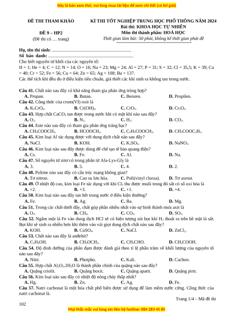 Đề Tốt nghiệp Hóa học 2024 theo đề tham khảo (Đề 9)