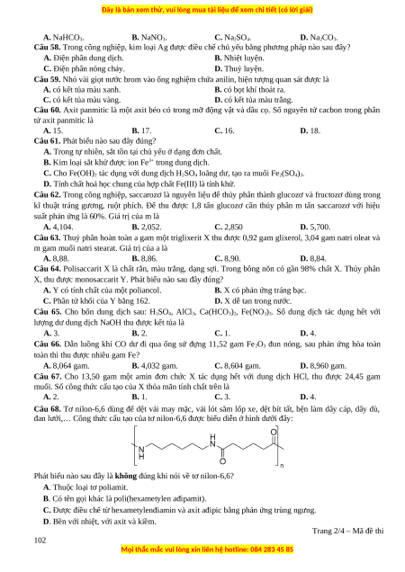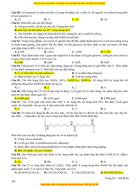 Câu 68. Tơ nilon-6,6 dùng để dệt vải may mặc, vải lót săm lốp xe, dệt bít tất, bện làm dây cáp, dây dù,