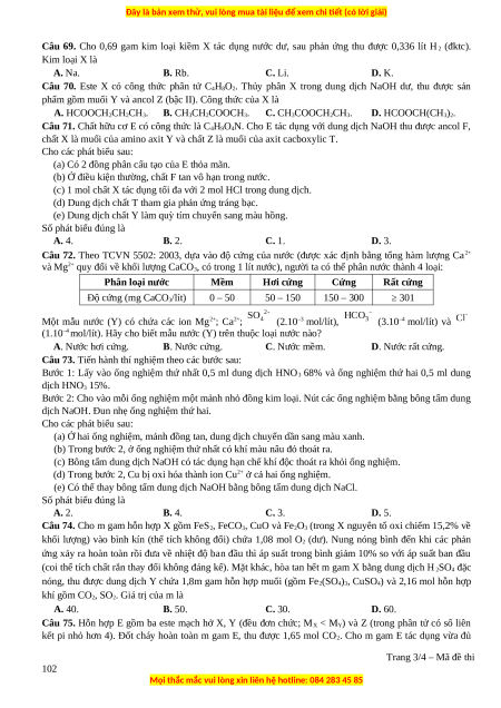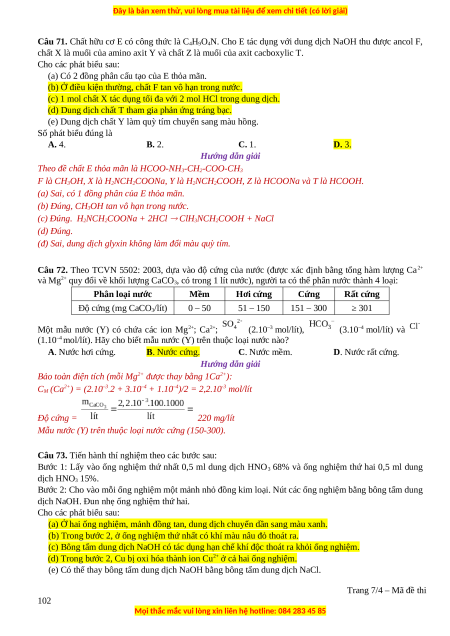 Câu 72. Theo TCVN 5502: 2003, dựa vào độ cứng của nước (được xác định bằng tổng hàm lượng Ca2+