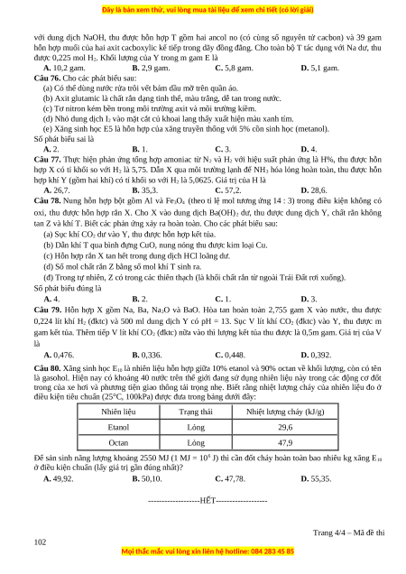 Câu 80. Xăng sinh học E10 là nhiên liệu hỗn hợp giữa 10% etanol và 90% octan về khối lượng, còn có tên