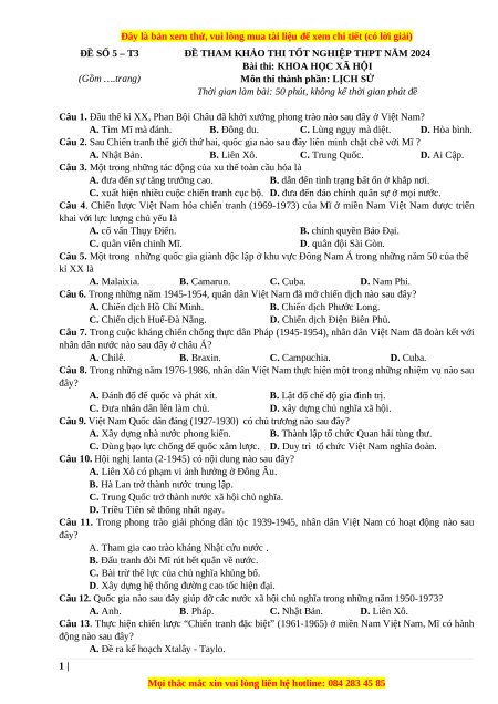 Đề Tốt nghiệp Lịch sử 2024 theo đề tham khảo (Đề 5)
