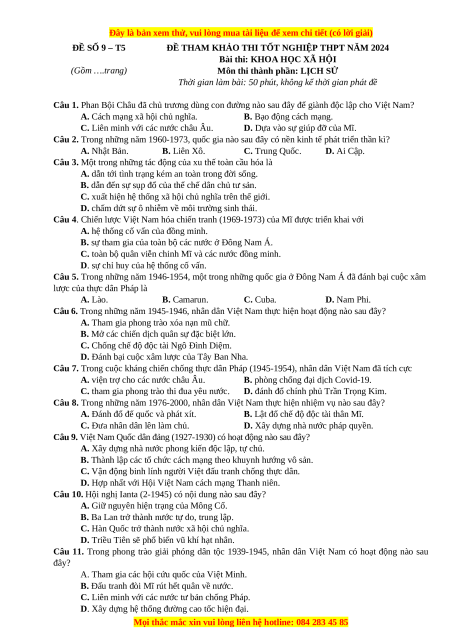 Đề Tốt nghiệp Lịch sử 2024 theo đề tham khảo (Đề 9)