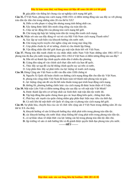D. lập trường vô sản có ảnh hưởng lớn và đã giành được quyền lãnh đạo phong trào yêu nước. --------HẾT--------