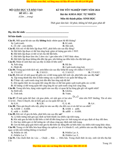 Đề Tốt nghiệp Sinh học 2024 theo đề tham khảo (Đề 1)