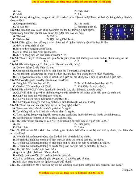 Câu 103. Loại đột biến NST nào sau đây có thể làm tăng hoặc giảm cường độ biểu hiện của tính trạng? Trang 2/6