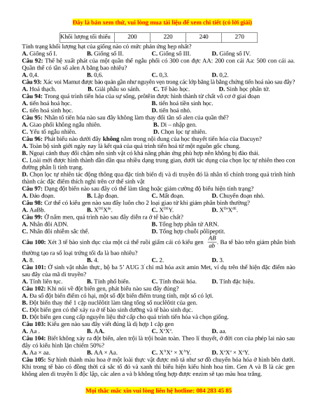 Câu 104: Biết không xảy ra đột biến, alen trội là trội hoàn toàn. Theo lí thuyết, ở đời con của phép lai nào sau