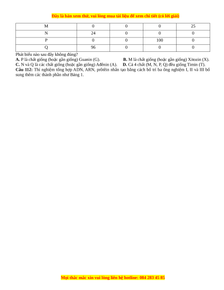 Câu 112: Thí nghiệm tổng hợp ADN, ARN, prôtêin nhân tạo bằng cách bố trí ba ống nghiệm I, II và III bổ