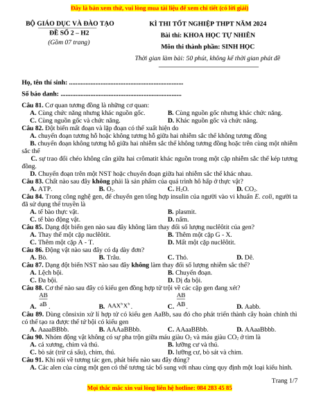 Đề Tốt nghiệp Sinh học 2024 theo đề tham khảo (Đề 2)