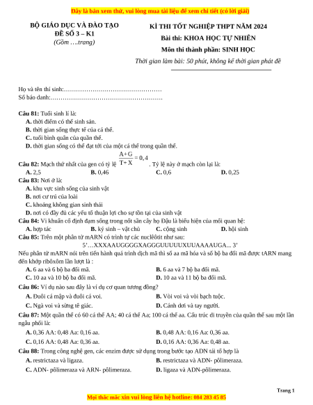 Đề Tốt nghiệp Sinh học 2024 theo đề tham khảo (Đề 3)
