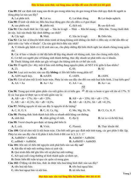Câu 100: Giả sử alen trội là trội hoàn toàn. Cho biết mỗi gen quy định một tính trạng, các gen phân li độc lập.