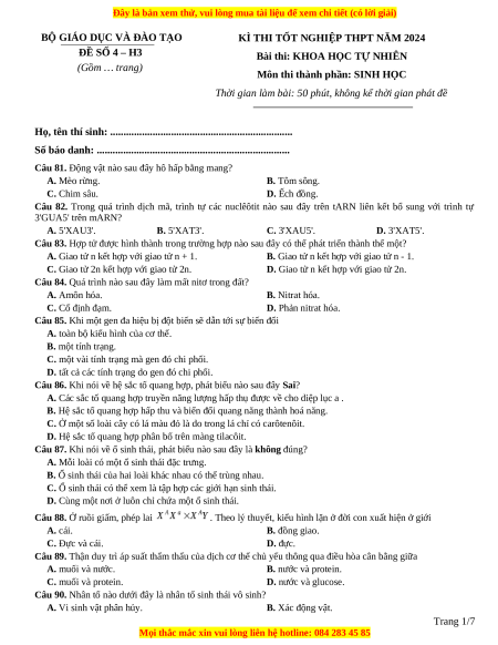 Bài thi: KHOA HỌC TỰ NHIÊN (Gồm … trang)