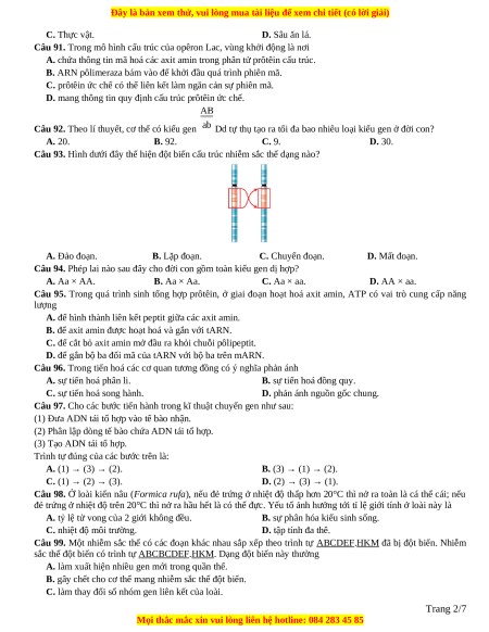 Câu 99. Một nhiễm sắc thể có các đoạn khác nhau sắp xếp theo trình tự ABCDEF.HKM đã bị đột biến. Nhiễm