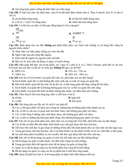 Câu 105. Theo thuyết tiến hoá tổng hợp, đơn vị tiến hoá cơ sở là A. tế bào. B. quần thể. C. cá thể. D. bào quan.