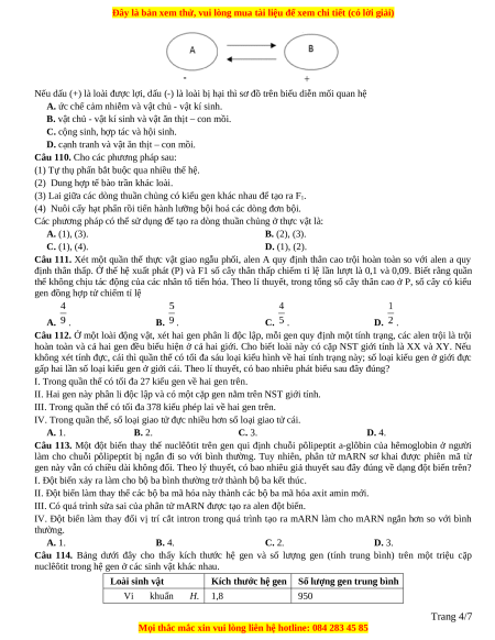 Câu 109. Quan hệ giữa hai loài A và B trong quần xã được biểu diễn bằng sơ đồ sau: Trang 3/7
