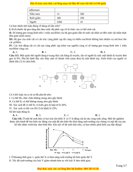 Câu 114. Bảng dưới đây cho thấy kích thước hệ gen và số lượng gen (tính trung bình) trên một triệu cặp