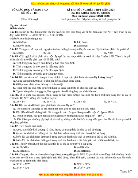 Đề Tốt nghiệp Sinh học 2024 theo đề tham khảo (Đề 7)