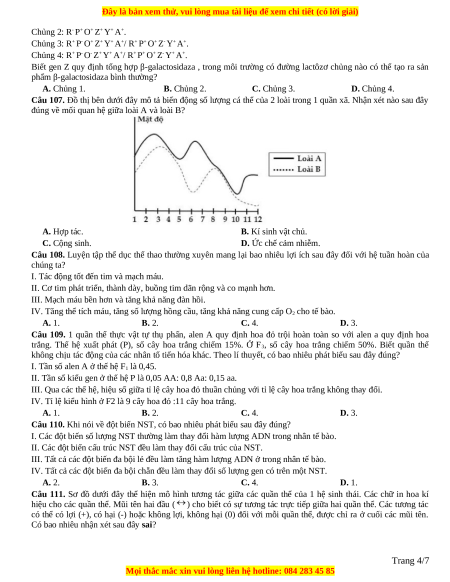 Câu 107. Đồ thị bên dưới đây mô tả biến động số lượng cá thể của 2 loài trong 1 quần xã. Nhận xét nào sau đây