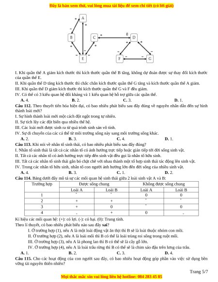 Câu 111. Sơ đồ dưới đây thể hiện mô hình tương tác giữa các quần thể của 1 hệ sinh thái. Các chữ in hoa kí