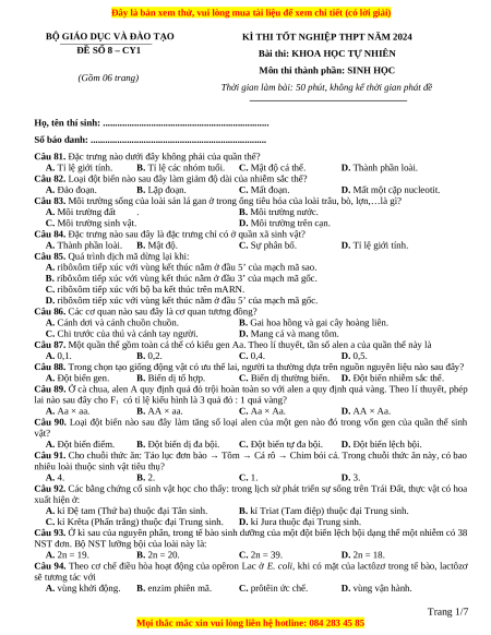 Bài thi: KHOA HỌC TỰ NHIÊN