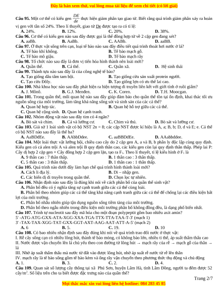 cây/m2. Số liệu trên cho ta biết được đặc trưng nào của quần thể? Trang 2/7
