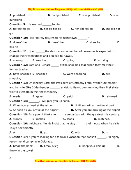 Question 9: He warned _______ too far. A. her not to go B. her do not go C. her did not go D. she did not go