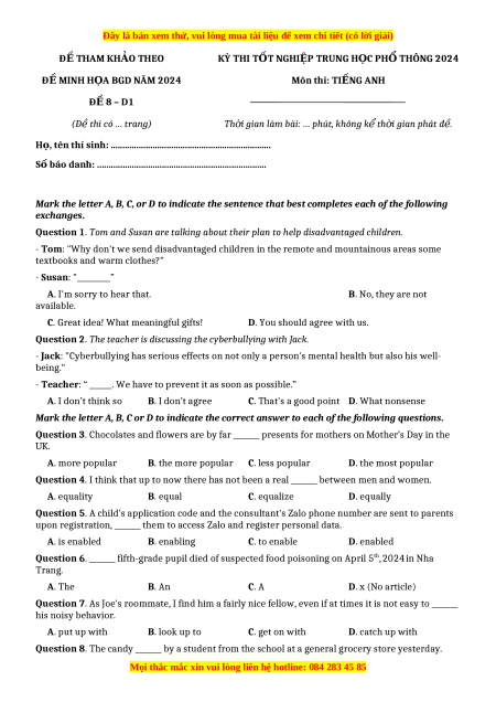 ĐỀ MINH H A BGD NĂM 2024 Ọ Môn thi: TI NG ANH Ế ĐỀ 8 – D1